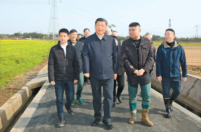 湖南是全國13個糧食主產(chǎn)省之一,水稻播種面積、總產(chǎn)量均居全國第一。當(dāng)天下午,習(xí)近平來到常德市鼎城區(qū)謝家鋪鎮(zhèn)港中坪村,走進當(dāng)?shù)丶Z食生產(chǎn)萬畝綜合示范片區(qū),察看秧苗培育和春耕備耕進展,聽取高質(zhì)量推進農(nóng)業(yè)現(xiàn)代化情況介紹,并同種糧大戶、農(nóng)技人員、基層干部一筆一筆算投入產(chǎn)出賬。習(xí)近平強調(diào),我國有14億多人口,糧食安全必須靠我們自己保證,中國人的飯碗應(yīng)該主要裝中國糧。要建設(shè)好高標(biāo)準(zhǔn)農(nóng)田,推行適度規(guī)模經(jīng)營,加強政策支持和示范引領(lǐng),加大良種、良機、良法推廣力度,在精耕細作上下功夫,進一步把糧食單產(chǎn)和品質(zhì)提上去,讓種糧也能夠致富,進而吸引更多農(nóng)戶參與發(fā)展現(xiàn)代化大農(nóng)業(yè),真正把中國特色農(nóng)業(yè)現(xiàn)代化之路走穩(wěn)走扎實。