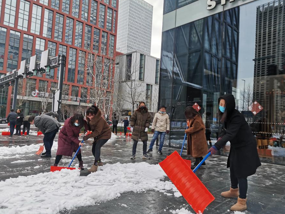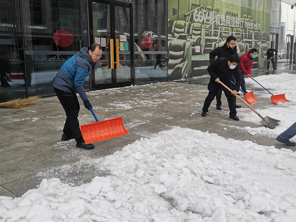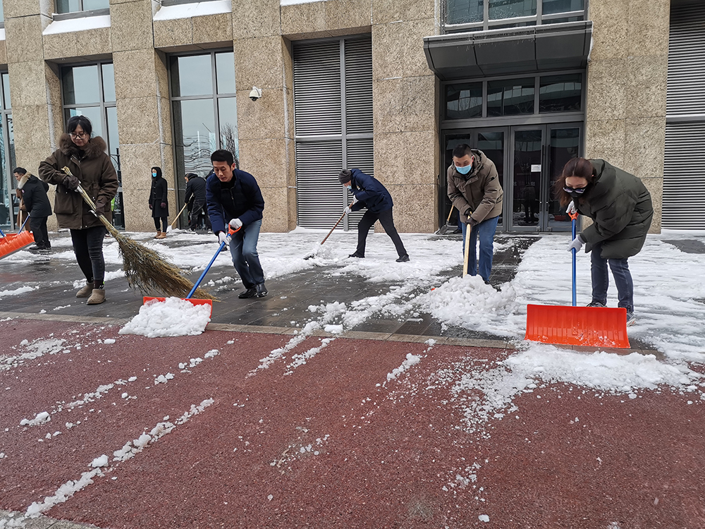 全體員工積極響應(yīng),整裝待發(fā)。9:10集合后向物業(yè)公司領(lǐng)取鏟雪工具便紛紛擼起衣袖,躬身奮力清掃。勞動(dòng)中,大家不懼寒風(fēng),相互配合,你鏟我掃,工具不夠就輪番作業(yè),一點(diǎn)點(diǎn)地將積雪和冰層鏟起集中堆放,很快就將一片區(qū)域清理完畢,又迅速轉(zhuǎn)戰(zhàn)下一片區(qū)域。