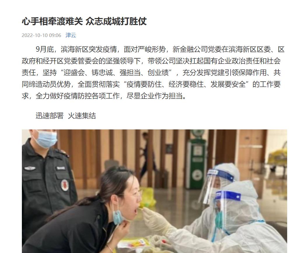 9月底,濱海新區(qū)突發(fā)疫情,面對(duì)嚴(yán)峻形勢(shì),新金融公司黨委在濱海新區(qū)區(qū)委、區(qū)政府和經(jīng)開區(qū)黨委管委會(huì)的堅(jiān)強(qiáng)領(lǐng)導(dǎo)下,帶領(lǐng)公司堅(jiān)決扛起國有企業(yè)政治責(zé)任和社會(huì)責(zé)任,堅(jiān)持“迎盛會(huì)、鑄忠誠、強(qiáng)擔(dān)當(dāng)、創(chuàng)業(yè)績”,充分發(fā)揮黨建引領(lǐng)保障作用、共同締造動(dòng)員優(yōu)勢(shì),全面貫徹落實(shí)“疫情要防住、經(jīng)濟(jì)要穩(wěn)住、發(fā)展要安全”的工作要求,全力做好疫情防控各項(xiàng)工作,盡顯企業(yè)作為擔(dān)當(dāng)。