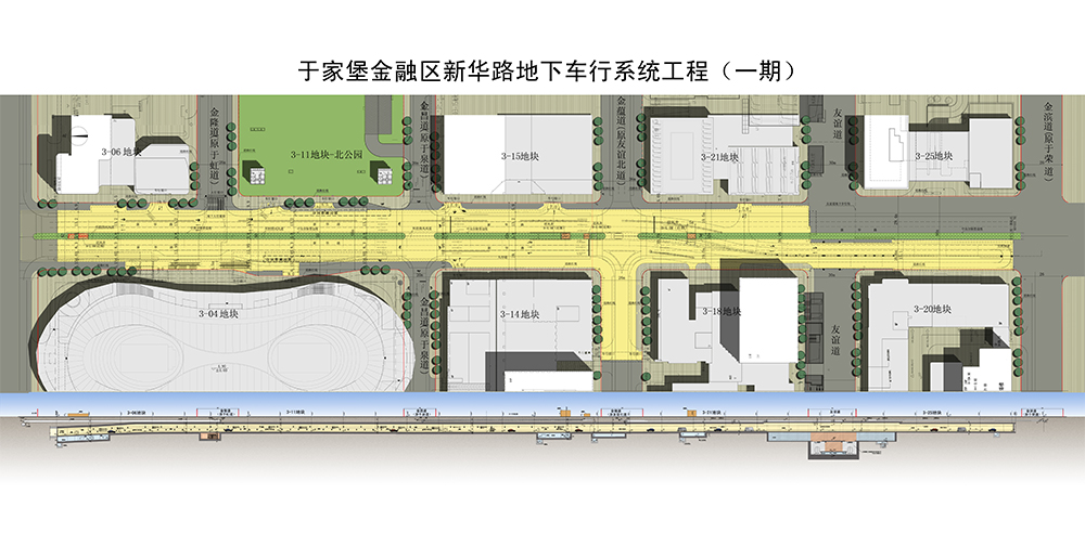 于家堡金融區(qū)新華路地下行車系統(tǒng)(一期)工程位于新華路地下,北至永太路,南至金濱路(原于榮道),主線長度約620m;金蘊道(原友誼北道)設(shè)置匝道連接主線與03-14地塊/03-18地塊,匝道長度約65m。友誼道地下商業(yè)街長度約為100m??偨ㄖ娣e為24952㎡,其中一層車道層建筑面積21950㎡,二層03-11地塊/03-04地塊人行通道及環(huán)控機房建筑面積3002㎡。建筑結(jié)構(gòu)形式為現(xiàn)澆鋼筋混凝土框架結(jié)構(gòu)。
